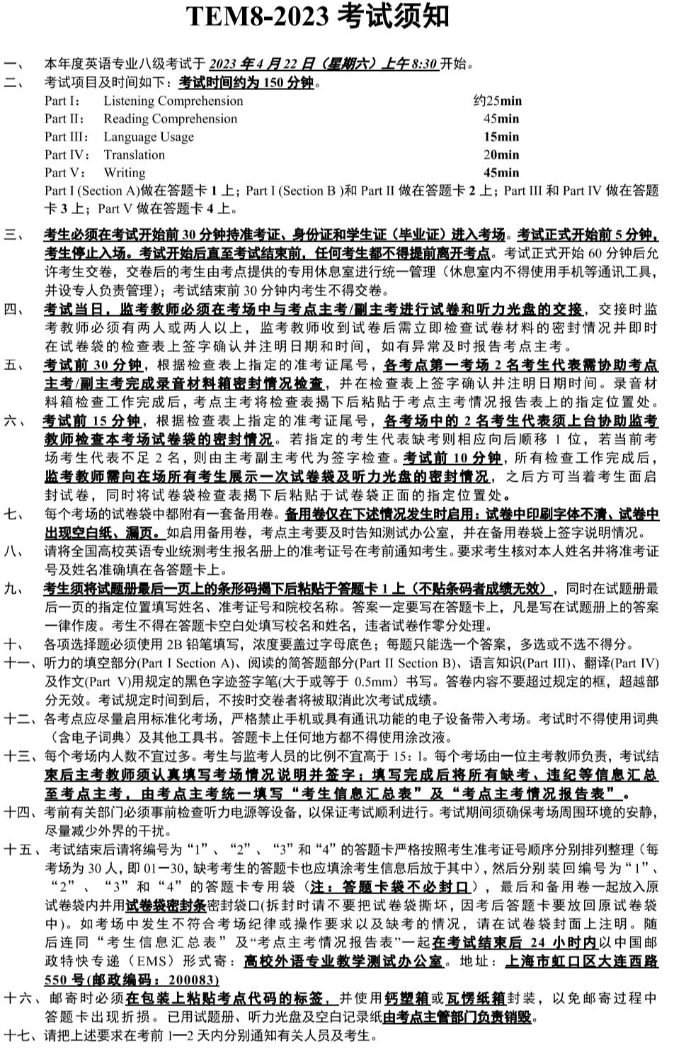 2023 年 4 月 22 日全国英语专业八级考试(TEM8)考生 注意事项