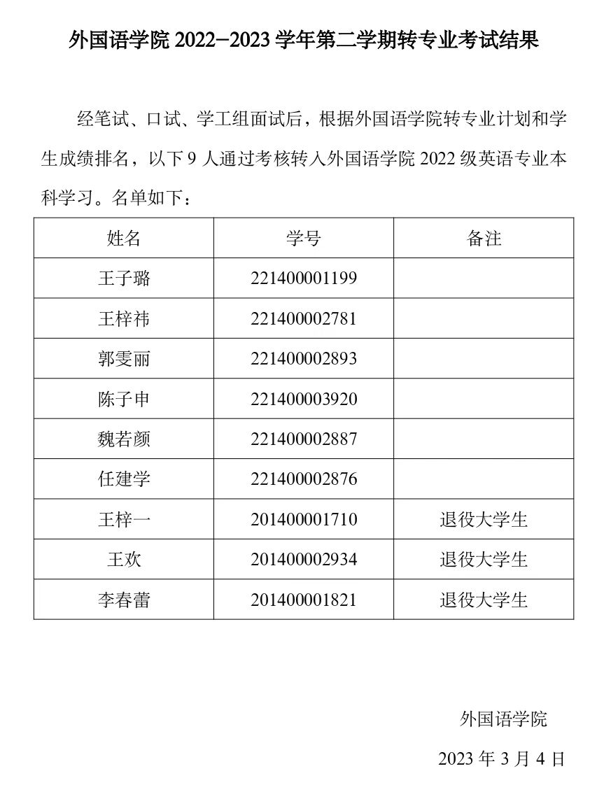 开云kaiyun官方网站2022-2023学年第二学期转专业考试结果