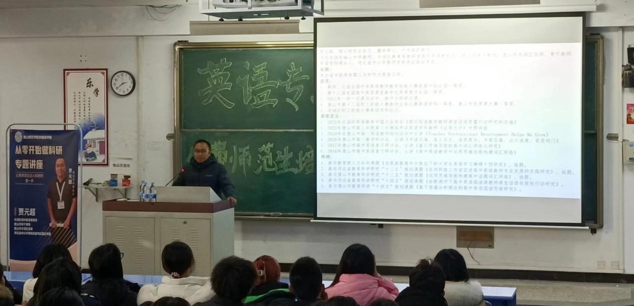 讲座活动邀请到了唐山市丰润区高中英语教研员贾元超老师,作为唐山市骨干教师及河北省中小学教师资格考试面试考官,贾老师结合时代背景与国家政策,为同学们讲述了科研的重要性,并带领同学们初步进入科研世界,认识科研、了解科研。在讲座过程中,同学们与贾老师积极交流,徜徉于科研的世界中,真切领会到科研的奇妙与乐趣。