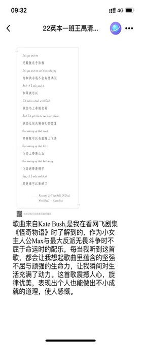 大家在看美剧的同时可以培养语感、获取知识、了解中美文化差异,该同学更是注意到了其配乐,在歌词中学习语法并且汲取到对待困难正确的态度。