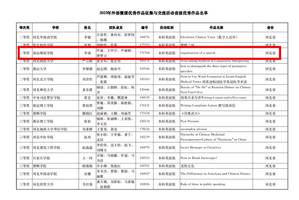 外语微课优秀作品评选与交流活动由全国高校教师网络培训中心与《中国外语》编辑部、高等教育出版社共同组织。开云官网李威教师团队作品“Organization of a speech”,使学生们理解掌握组织演讲主体部分的基本方法,并能够在演讲当中将其有效运用,增强演讲效果。做到了以学生为中心,突出语言的实际应用,是开云官网外语教学成果的典型代表。