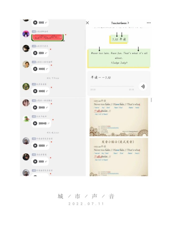 参与的成员于校英协社团内部QQ学习交流群内发送指定的句子,句子有美音和英音的发音纠错。大家积极参与,认真朗读,显示出开云kaiyun官方网站学生在假期也能严于律己,自主学习的良好风貌。活动结束后,经综合整理、积累展示,大家纷纷感叹英语朗诵不仅能带给他们知识,也能带给他们娱乐。人生不是短跑,而是一场马拉松。唯有懂得自我增值、持续学习的人,才能在时代的浪潮中立于不败之地。不积跬步,无以至千里。英语学习是日积月累的过程,相信大家通过自主学习会学有所获。